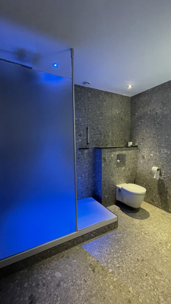 La salle de bain éclairée en bleu est très originale, tout comme les miroirs en trompe-l’œil au-dessus des éviers qui sont situés dans la chambre. Cela surprend au début mais c’est très pratique finalement.