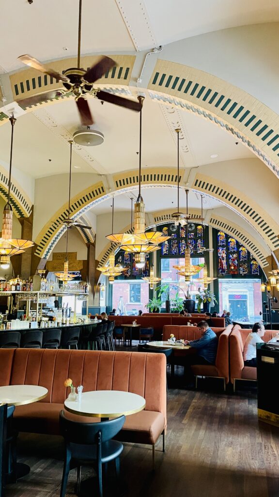 La salle du restaurant, où se prend le petit déjeuner, est un véritable trésor architectural. Un lieu à lui seul à ne pas manquer. D’ailleurs le restaurant est accessible le reste de la journée, même si vous ne résidez pas à l’hôtel.